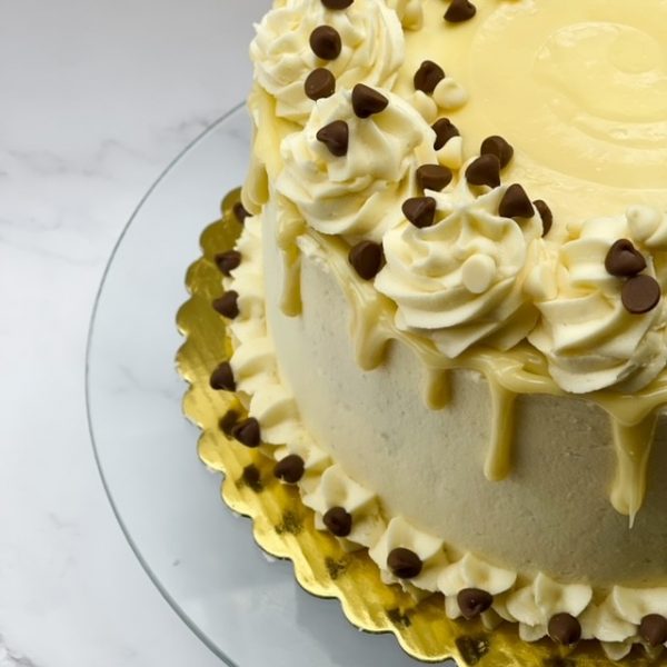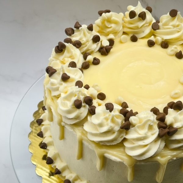 This delicious lemon and chocolate layer cake is covered in a white chocolate and lemon buttercream, white chocolate ganache and finished with more chocolate chips and lemon zest