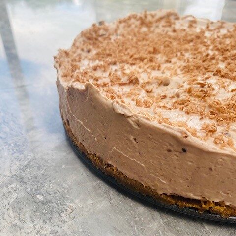 - Grease and line the base of a 20cm round, deep, loose bottomed cake tin. Add the biscuit mixture to the cake tin and pat it flat with the back of a spoon. Leave to set in the fridge for about 30 mins.