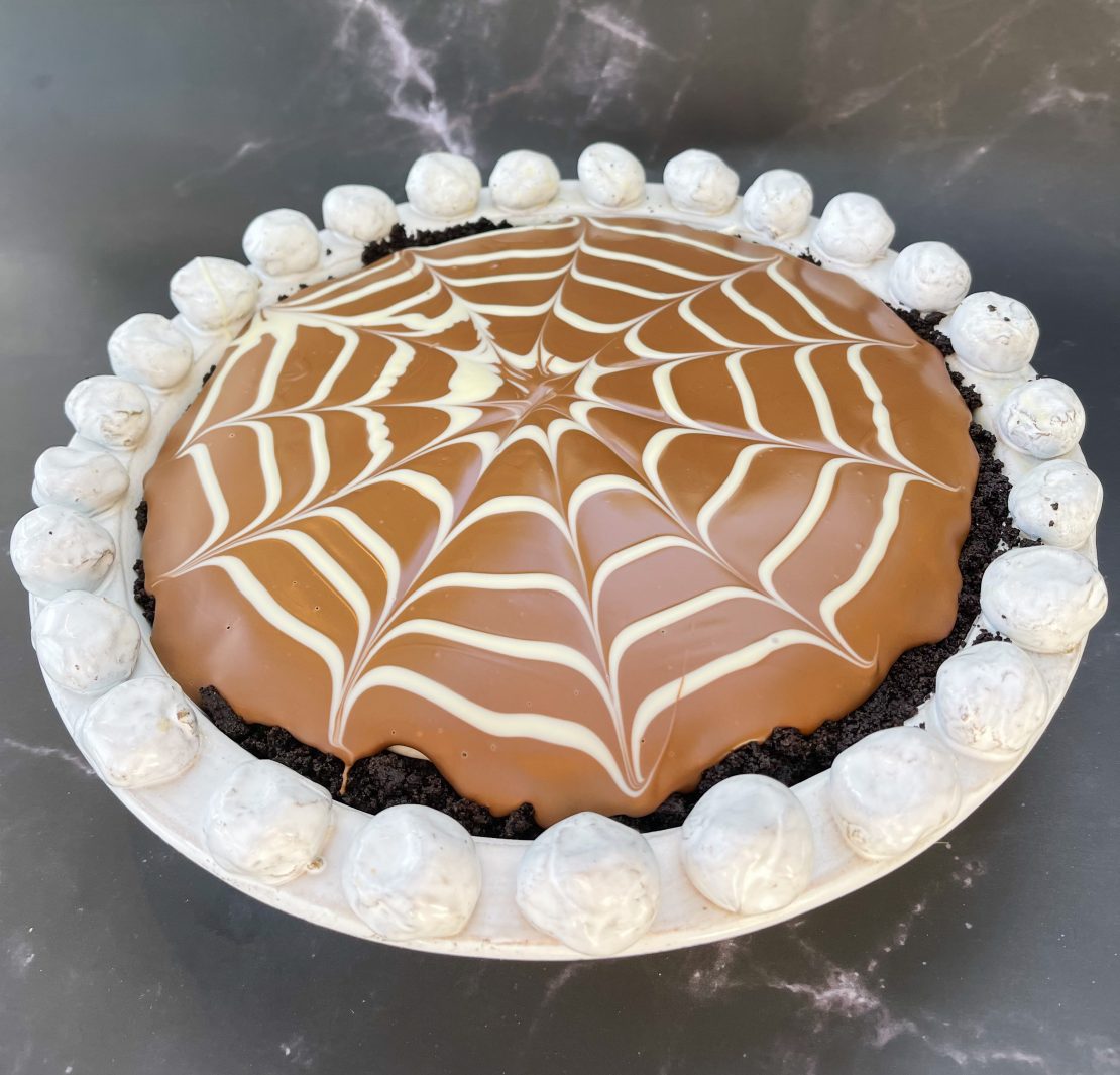- Use a cocktail stick or skewer, start at the centre of the cake, drag the stick straight out to the edges to make a spider’s web. Chill for an hour or until you are ready to serve.