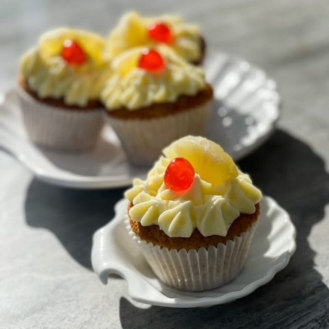 8. Either using a spoon or pipe on to your fully cooled cupcakes and top with glace cherries and pineapple chunks